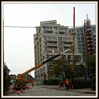 On my way to the office today I captured this picture of Hydro crews installing new polls. It was interesting to watch the care they were taking while raising the pole. I was a little surprised to see that it was just a bare pole with nothing to attach the wires to.