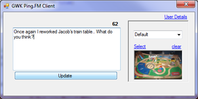 I’m happy to say that the first beta of the desktop application is almost done. It will support selecting of Posting Method and posting images. I’m not sure about the current interface, I’m still working out what I want it to look like. Once I’ve got this beta working, I’m thinking of working on a WPF interface and a Windows Mobile version.