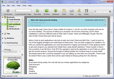 It’s been 2 weeks since I reinstalled it on my computers and phone and I’m loving the simple-ness of the interface. To be fair I’m not doing much with the more advanced features, but the simple ability to take a note and have it synced with the web so that I can access it from any web browser or computer, I have the portable Evernote client on my memory stick, is just great. I highly recommend Evernote for anyone looking for a connected notepad.