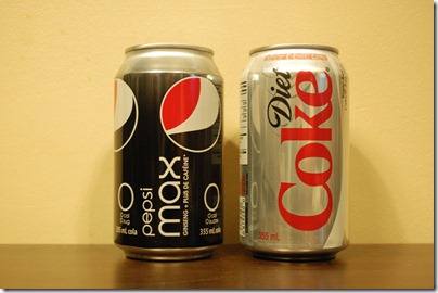 Tonight I decided to take a picture of two sides of my biggest vice. I drink way to much pop, I’ve moved to diet but I don’t think that’s really better for me. To make it worse Pepsi has introduced Pepsi Max, with more Caffeine and Ginseng turning me from my traditional Coke. It seems wrong that the drink I choose first now is Pepsi, but it is. Of course I really should be cutting back my caffeine and Pepsi Max is definitely not the way to do that. Oh well we’re all allowed one vice, aren’t we?