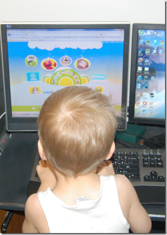 Tonight I captured Jacob as he sat at my desk doing computer time. He was very excited to to play Caillou on PBSKids.org. He’s still a little unsure with the mouse, but he tries. Most of the time I control the mouse to where he points to. I’m thinking I’m going to have to work on his mouse skills, but to help with that I’m going to pick up a kids mouse. Something better suited for his small hands.