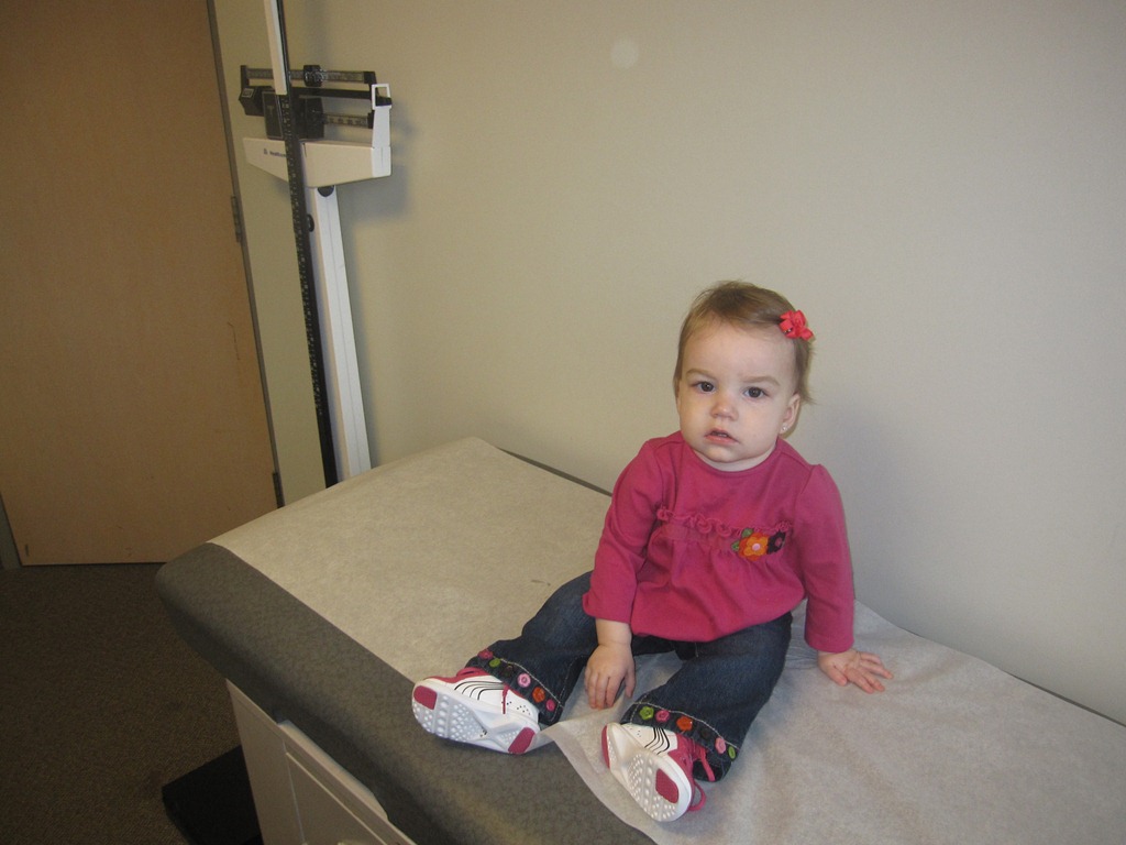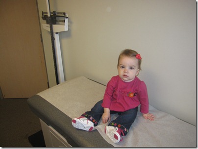 Violet One Year Appointment 2010-01-25 003 Today was Violet’s one year appointment at the doctors. It included to shots. It’s the first time she’s take them in her arms. The doctor thinks she’s growing just fine. Though she’s slowed a little. Today she came in at 19lbs and around 29.5 Inches long. We’re a little worried that our little cupcake may be allergic to Peanuts, she has had some reactions after getting into Jacob’s Peanut Butter Sandwiches. The doctor is sending her for tests to be sure but prescribed an epinephrine injection, just in case. And of course Peanut Butter is still bannedd from our house.  All and all our little angel is doing well and growing up just to fast…
