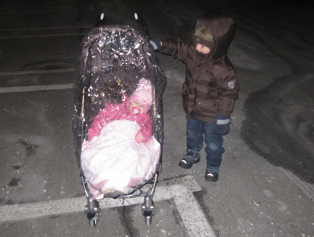 Tonight while Melissa was off at work, I bundled up the kids and headed out for a little walk with my mom to shoppers to pick up some supplies for Jacob to take to pre-school tomorrow. We’re putting together little Valentines packages for each of his class mates. While we were walking Jacob tried to push the stroller but it was to hard for him with his mitts on. So he was content just holding on to the side.