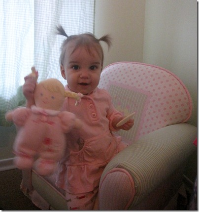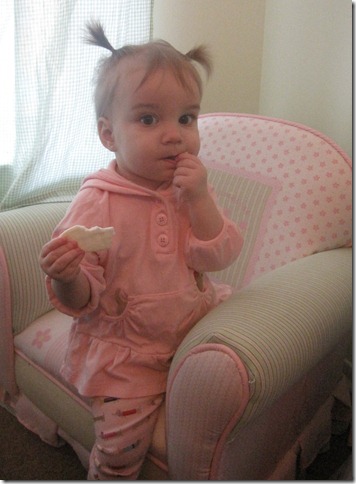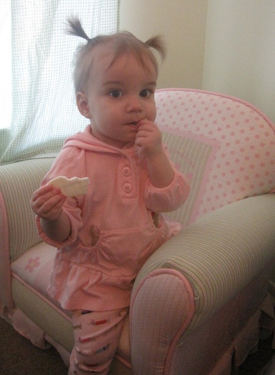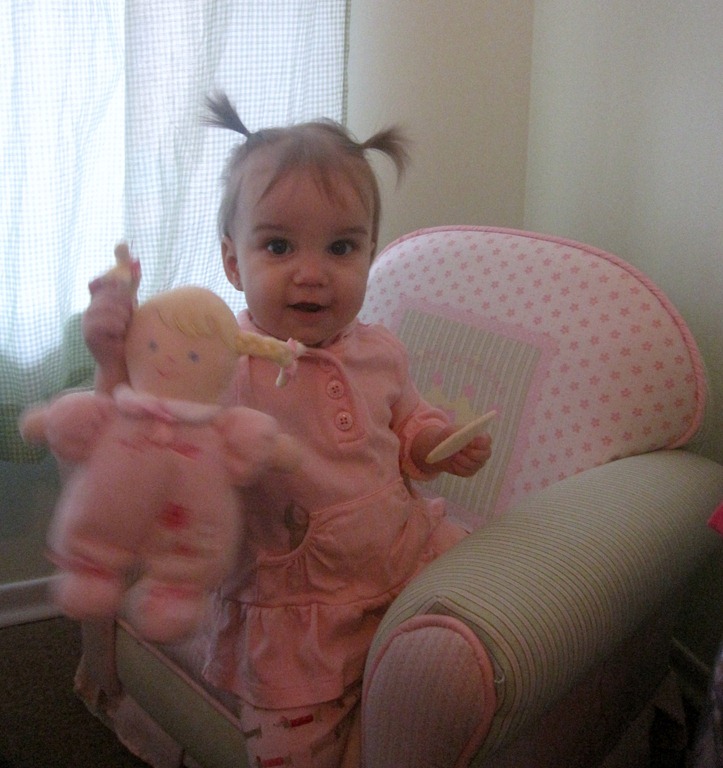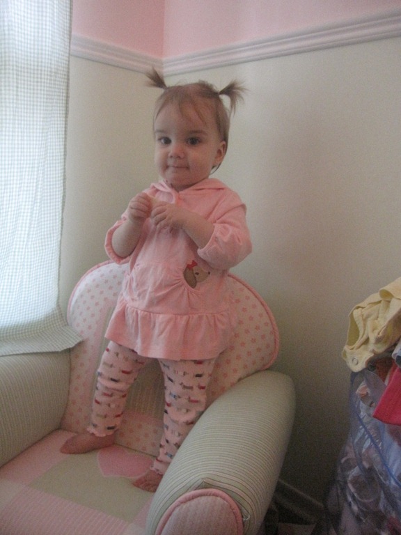 Well it took just under 13 months but Melissa has finally managed to give Violet pigtails. Not sure what inspired her to try this morning but she did and found that it worked. They are pretty small pigtails but I have to say they are cute. Though they represent something I don’t like admitting, My baby girl is growing up.