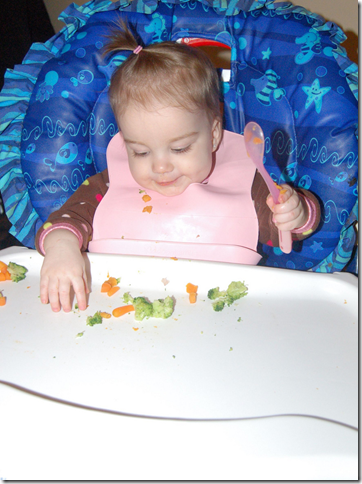 Recently during meals Violet has asserted her independents . She is happiest when we let her feed herself. Of course we still sit there and help her, but she’s getting to the point were that is not needed. Of course she still hasn’t worked out how to use the spoon but she’s trying.