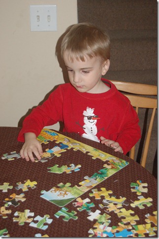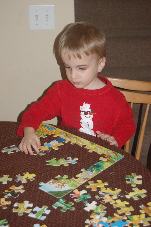 Today was a nice lazy day around the house. To pass the time Jacob asked if he could do puzzles. He did 5 or 6 different puzzles. He’s like puzzles for a long time, but lately he hasn’t been doing them. It was great to see that he could still put them together without help.