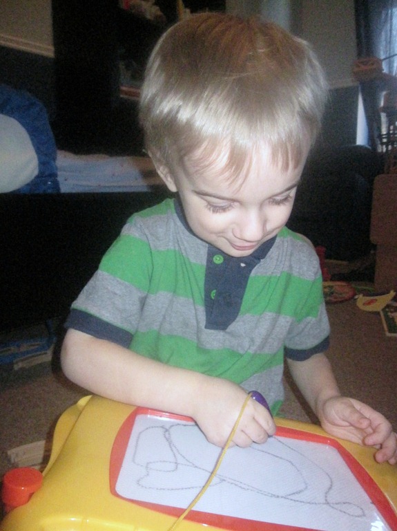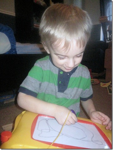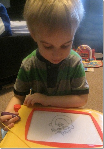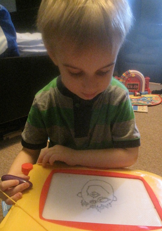 This morning while Violet napped Jacob was playing in his room. I found him drawing on his Doodle Pad. He was really getting into it. So maybe the Pre-school is paying off.