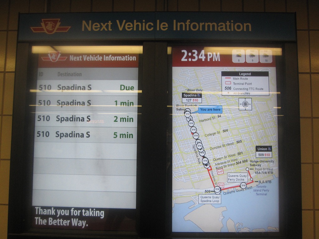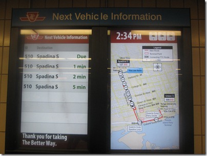 When I was thinking about what to shoot for today’s photo two random things came together to almost make my choice for me. The first was a client visit, we got a call last week to from a client we’d all but written off, the second was an announcement by the TTC of the expanded availability of GPS based arrival times for most streetcar routes in the city. I spent some time looking at it before heading to the clients this afternoon. So when I got to Spadina station, where a the first trial installation of the GPS system is installed for the publics use, I thought great and snapped today’s picture. The only problem is now when I got to site to check out how it works, I only see two routes not the 5 or 6 I saw earlier. The service when it goes live will be a great help to the TTC riders of the city, I just hope we don’t have to long and that they will offer an open API so people can use the information in their own applications.