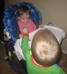 Ok first you teaching him to put the dishes in the dishwasher and now feed the baby sister talk about cheap labour. HAHA what will be next him scrubbing the floors you can just call him cinderfella. Just kidding.LMAO So cute he is such a thoughful wonderful little boy.