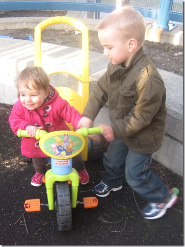 Today when I got home from work, I got the kids coats and shoes on and grabbed some meat from my freezer and headed outside. It was Violet’s first trip to the playground since she has begun feeling somewhat comfortable on her feet. She’s not really ready to go running with the other kids but she did her best to get into the fun. The only hard part about the trip to the playground was having to take her back with me every time I checked on the BBQ.