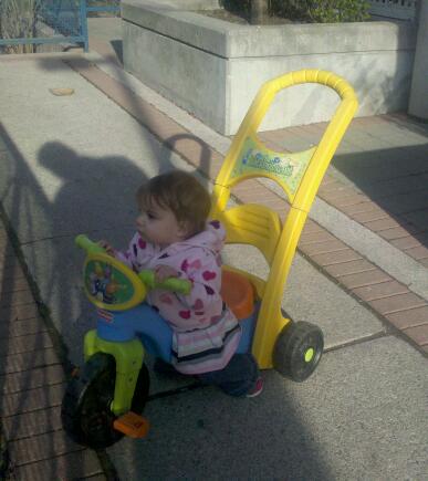 This evening while I grilled some burgers Jacob played in the playground with some neighborhood kids and Violet pulled out Jacob’s big wheel and tried to take it for a spin. She couldn’t reach the petals but managed take it out of our yard.