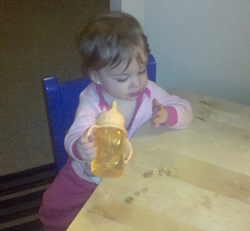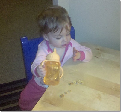 Today Violet sat at the little table enjoying her water and Cheerios. It’s the first time I’ve seen her sitting and eating at the little table. I’ve seen her sit on one of the chairs while trying to play with Jacob before but this is the first time I’ve seen her sitting and eating. (I will not go on about her growing up to fast…)