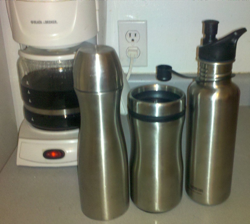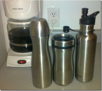 In the picture you see all the drinks I pack when heading off to the office, my Travel mug, my Thermos, and my Water Canteen that I got for Fathers day. The best thing about the Thermos is that it keeps me from buying Diet-Coke or Pepsi Max to drink during the day.