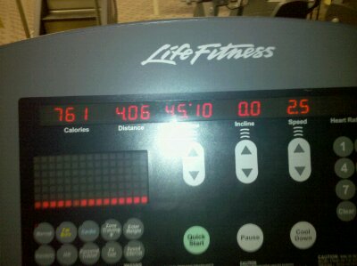 Today I headed out to the Gym with Melissa. It felt like its been weeks sence I headed to the gym. Of course its been maybe a week. I thought about doing different equipment, like Melissa’s favourite Elliptical or maybe weights, but in the end I just did 45 minutes on the treadmill. I managed to run for 3 sets of ten at around 6 mph plus a nice 3 minute 8.5 mph sprint at the end.