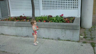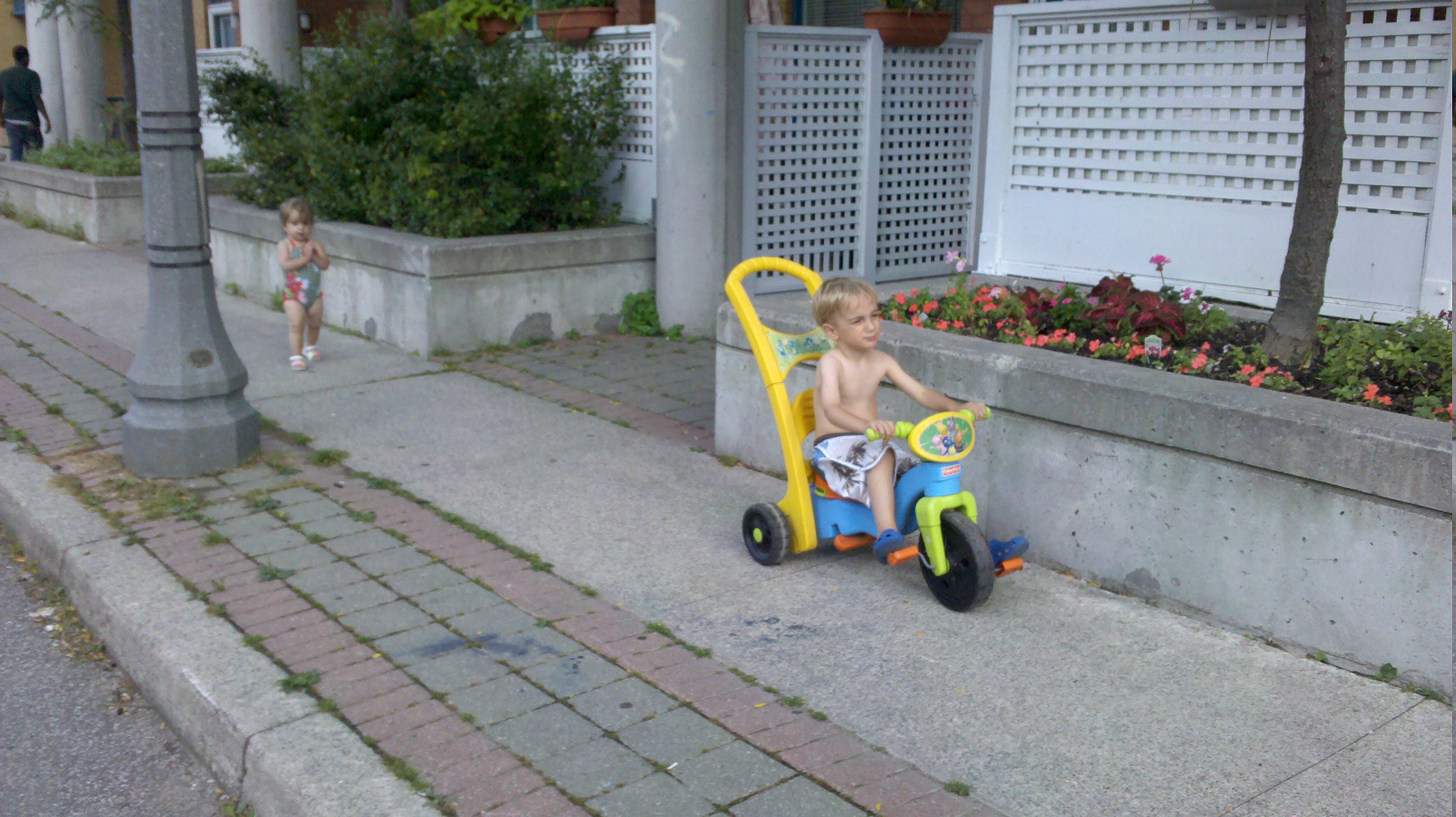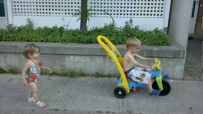 Today was a lazy vaction day, which was nice. We puttered about in the morning, with errins and chores. Then after a nap for Violet and a movie for Jacob we went out to the splash pad to play. I though for sure that my picture of the way would come from there but the kids had other ideas. When we got home Jacob wanted to take is big wheel for a spin, but so did Violet. So as Jacob rode off she gave chase.