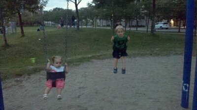 Today after dinner the kids and I took a walk, first to the bank and then the park. When we got the Jacob ran to the apparatus to play with the kids. Violet on the hand only had eyes for the swings. So I picked her up and set her in the swing. After a while the kids left and so Jacob came over to Join her. Between pushing them I snapped this picture.