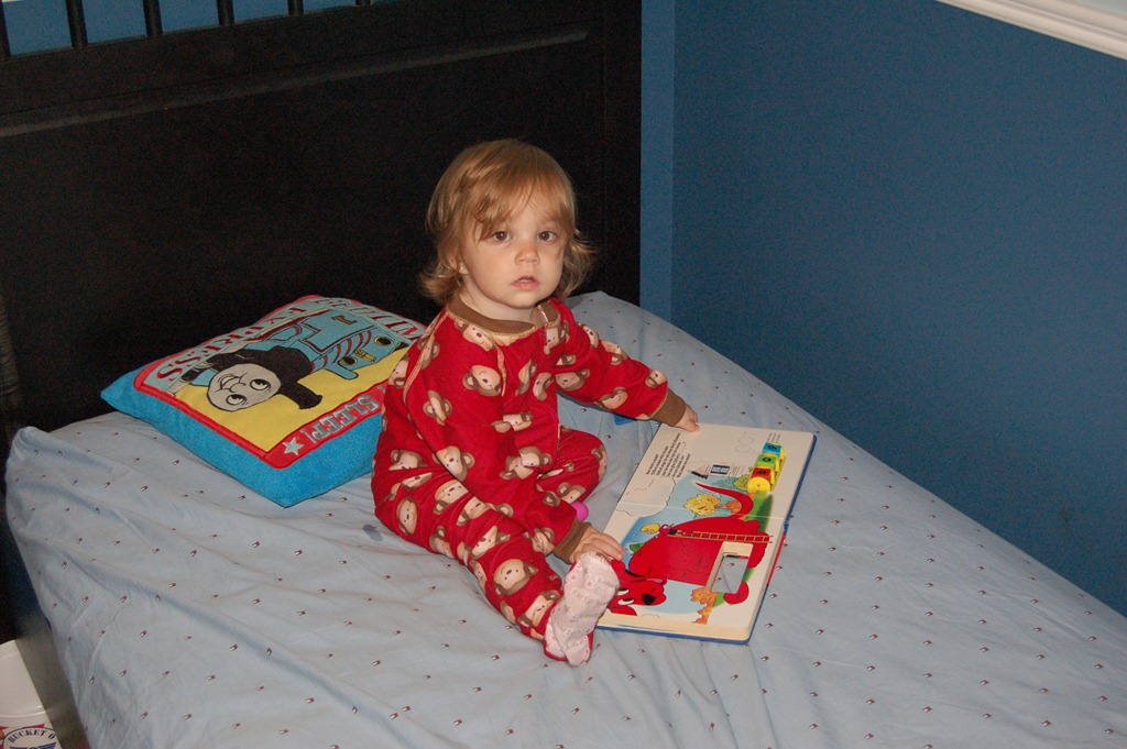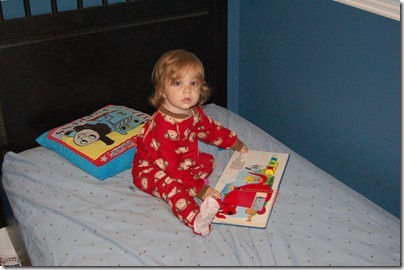 Today was a great day, I spent most of it with just me and the kids. It was nice to spend time with them. From colouring at the little table to rebuilding Jacob’s train set it was a great day. At one time while Jacob and I were playing with his Crane and Trains Violet climbed onto the bed and tried to read one of Jacob’s Clifford books. I couldn’t help but snap a few pictures. She choose her sleeper from her drawer. She pulled it out while we were playing in her room and brought it over to me. She was quite insistent that I put it on her. It’s a little big on her.