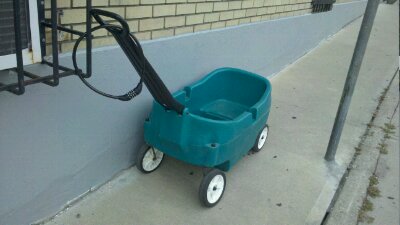 I took my picture of the day as I was walking to the subway near my work. It seemed an odd sight. A kids wagon, locked up like a bike. It’s just not something that I’d seen before, so I snapped a picture. Of course as I think about it now I realize that it makes sence. After all you might not want to bring your wagon inside, so why not lock them up. I wonder if I should start bringing my bicycle lock with me when I take the kids to local stores in the wagon?