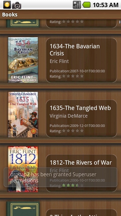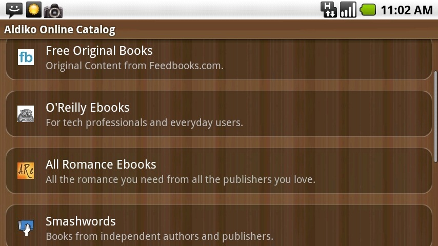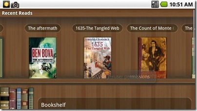 Aldiko has a very simple interface, when you first launch it you see a shelf of the books you have recently read. Below you to options, Bookshelf, where you can browse the rest of the books you have on your phone, and Download books, which takes you to a number of sites where you can download buy books or download free ones. You can also add Custom Catalogues so you can get books from more sources, including Baen Books a publisher that gets E-books.