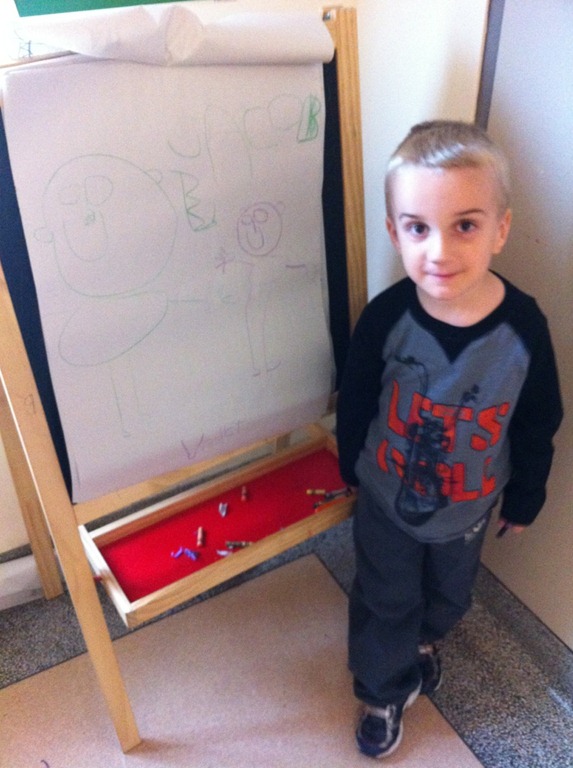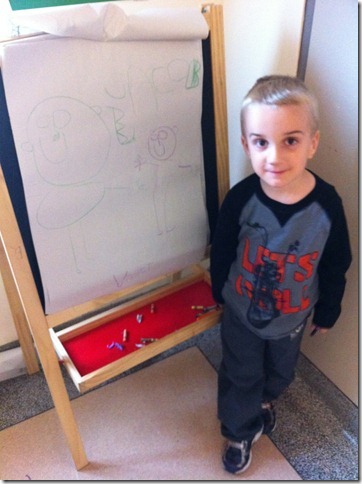 Today we had another visit to the Asthma clinic. While waiting for our turn Jacob showed off his artistic side, drawing a couple of pictures, first with Mommy, Daddy and Chloe. Then one of Violet and him. I was quite impressed with the hands and feet. Not to mention that he included names of the people he drew.