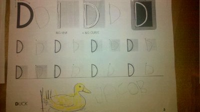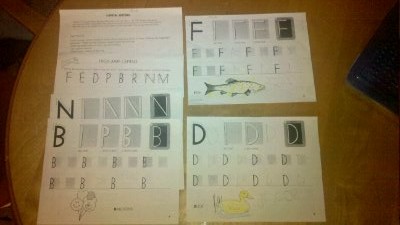 Today Jacob came home from school with a bunch of exercises for him to do at home. There are 4 sheets each with a different letter for him to practice writing. Part of me things it’s strange that a kindergartener is getting homework but another part is glad, especially when I watch Melissa sit with out still man and work on it. I just seems like a perfect little moment.