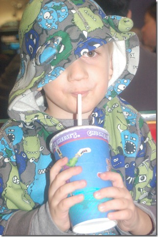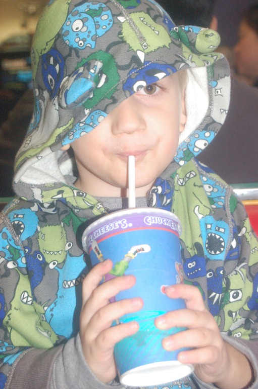 Today our picture is of Jacob enjoying his Special Pop at Chuck E. Cheese’s. We were there celebrating Jacob’s success at school. It’s great to see him eager to go to school every day and if that means he gets a sicker when he gets home and a reward when he collects 10 stickers then I’m all for it.
