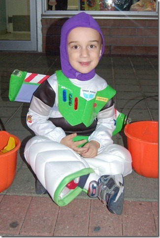 The evening was a great success though it was interesting to watch Violet as she approached different houses. Some times she would charge up to the door, others she hung back clinging to mommy or daddy like a shy little thing. Of course most of our trick or treating took place after 7 which is her usual bed time so that added to the fun. We ended up taking her home early and putting her to bed before Jacob and the candy got home. This had the benefit that we didn’t have her trying to get at it before we had a chance to separate all the candy with peanuts or nuts. I can see that might be a bit of a challenge in the years to come.