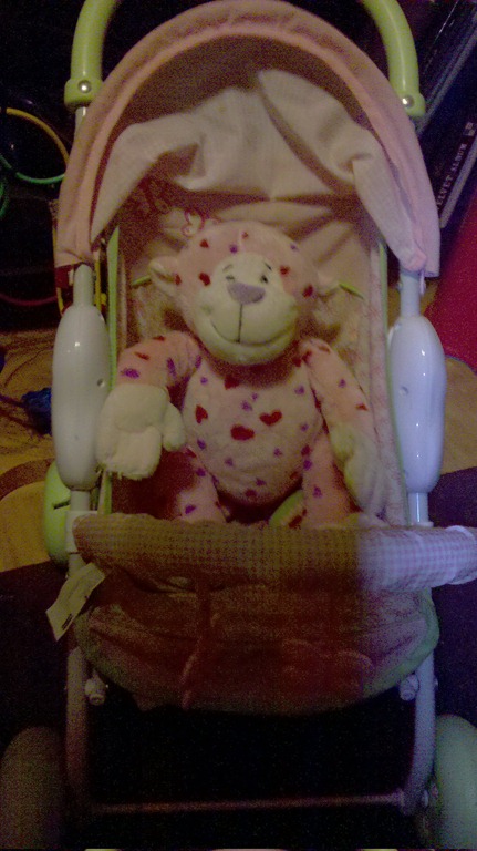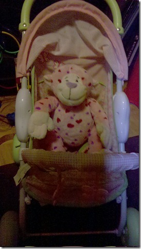 Today’s picture is of Violet’s stuffed Monkey, relaxing in her dolls stroller. Our little Violet loves her dolls and stuffed animals. She pushes them in her stroller or tries to put diapers on them. She’ll even lay them down and cover them with a blanket and say ‘shhh’, like she’s putting them to bed. I’m not sure if I’d seen the Monkey in the stroller before today, but it was there a lot today.