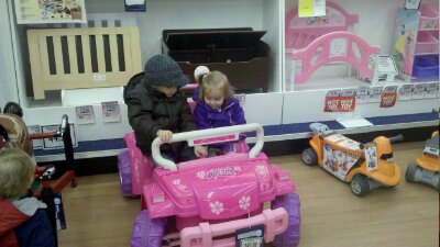 Today we braved Toys’r’us to return a toy and see if they had restocked any of the sale items that weren’t in stock last night. It was a bit of a mad house, and it’ll only get worse. I snapped the picture of our two little ones going for a drive while Melissa checked out.