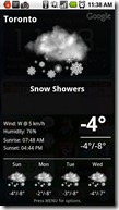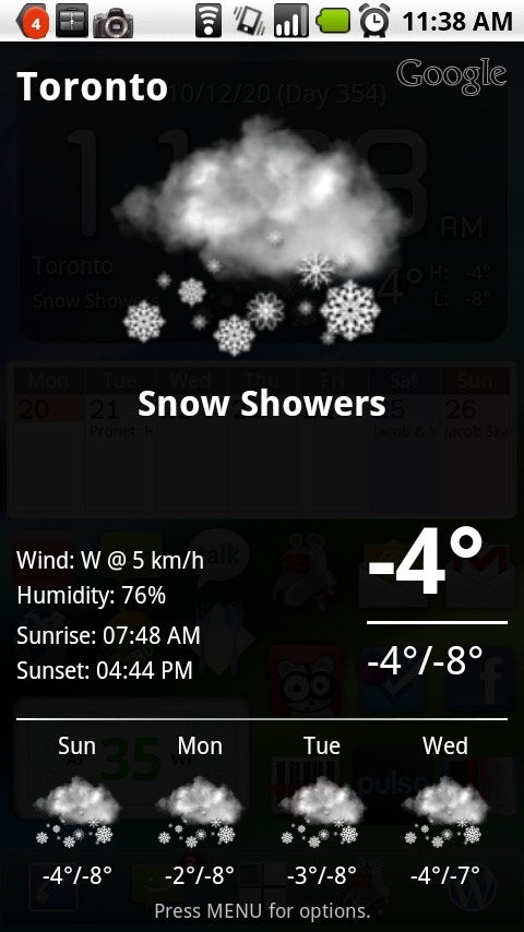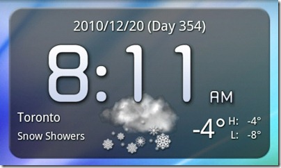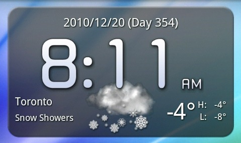 CAP2010122011381The app has a number of settings that allow you to customize how it looks and works. The support for skins allows for any number of changes to the look and feel, though I’ve never felt the need to move from the standard look. It also supports events with clicking on the different aspects of the widget, the date, time or weather. By default they bring up the settings but can easily be changed to launch the app of your choice. The weather defaults to a weather screen that has a more detailed view of the current weather plus a 4 day forecast. There is a free and paid version and though I’m considering the moving to the paid version to support the developer but haven’t yet.