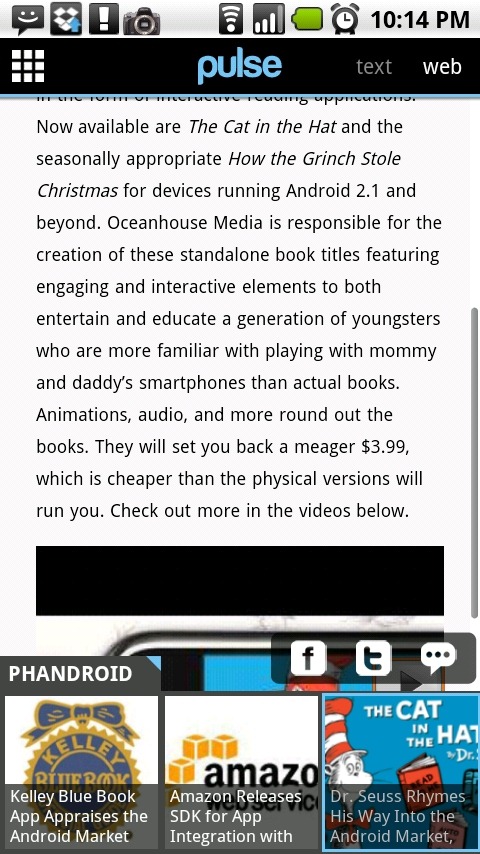 It’s available for Android, iPhone and iPad, though I’ve only tried it on my Android phone, I hope to install it on an iPod Touch soon and I’ll post an update with the differences when I do. If you are looking for an easy way to keep track of multiple feeds I highly recommend you give Pulse a try.