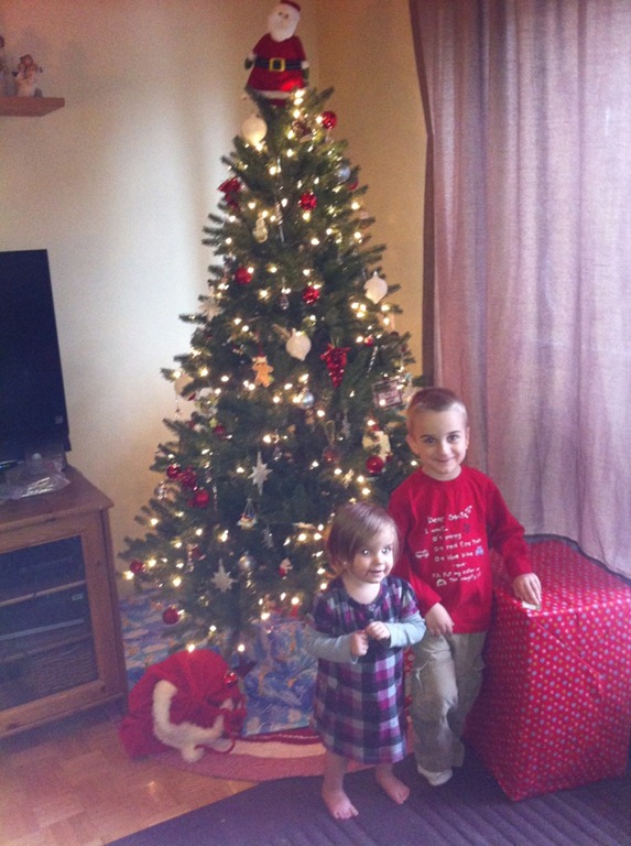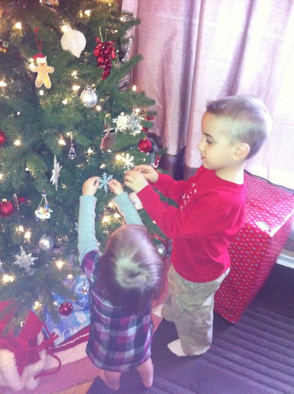 Today Jacob and Violet decorated the tree, well Jacob put on the ornaments and Violet took them off. Of course they needed a little help with the higher ornaments.