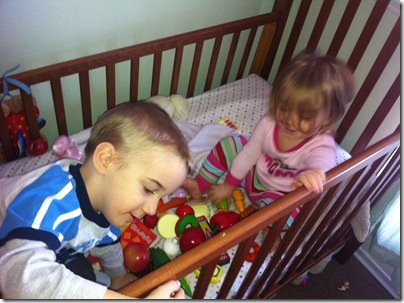 Jacob usually wakes up before Melissa or me. Usually he’s a good boy and comes wakes us up. This morning he did something a little different. Today he went into Violet’s room and took the food from her kitchen dumped it into her crib and climbed in. When I came in and asked what they were doing, they told me they were having a picnic. As a parent I’m really glad to see how well the two of them can play together. I guess the only question is how long does that last?