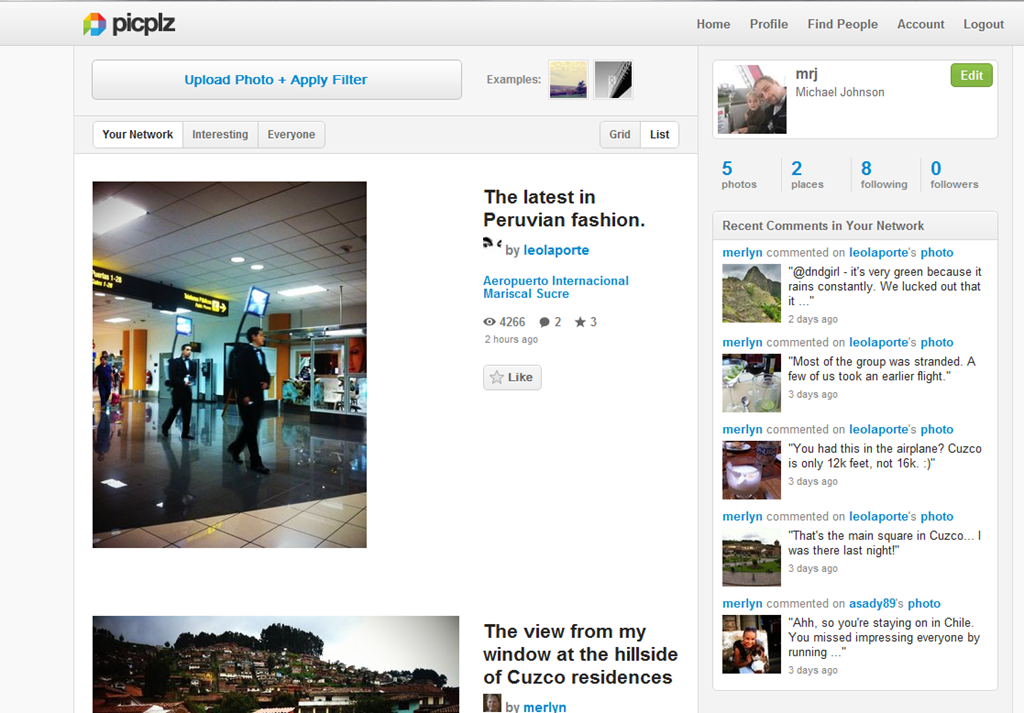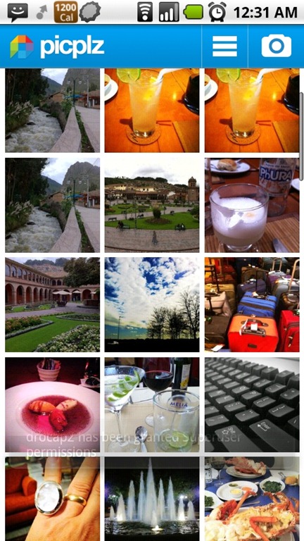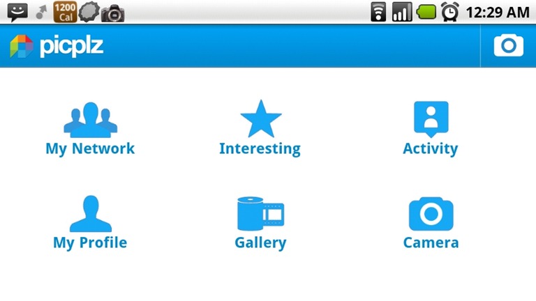The Application on android recently received an update to streamline the interface and improve functionality. When you first launch it you have 6 options,My Network, Interesting, Activity, My Profile Gallery and Camera. My Network and Interesting are for reviewing pictures posted to picplz. My Network being restricted to the users you are following, Interesting on the other hand show recent pictures from anyone on the system. Activity is about the comments, by people you are following. My Profile gives you a preview of what other people see when they look up your picplz account, while Gallery and Camera are for adding pictures to picplz.
