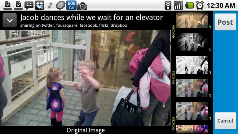 When you are adding a picture, either from the phones gallery or when you take a new picture you are presented with some options. You can ca picture presents you with a simple interface. Across the top is an interface that drops down for adding a caption and selecting which services to share your photo with, more on them in a moment. In landscape mode (In portrait its along the bottom) along the left had side a list of thumbnails previewing the effects that you can apply to your photo. Choosing one applies it to the main image allowing you to see what it will look like before posting.