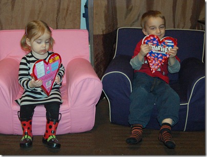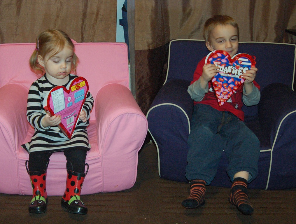 Today is Valentines day and our little family celebrated. My Picture is of the kids in their chairs with their Valentines treats from mommy and daddy. I was hopping for a better picture but when you have to young kids wanting treats it can be hard to get them to sit still.