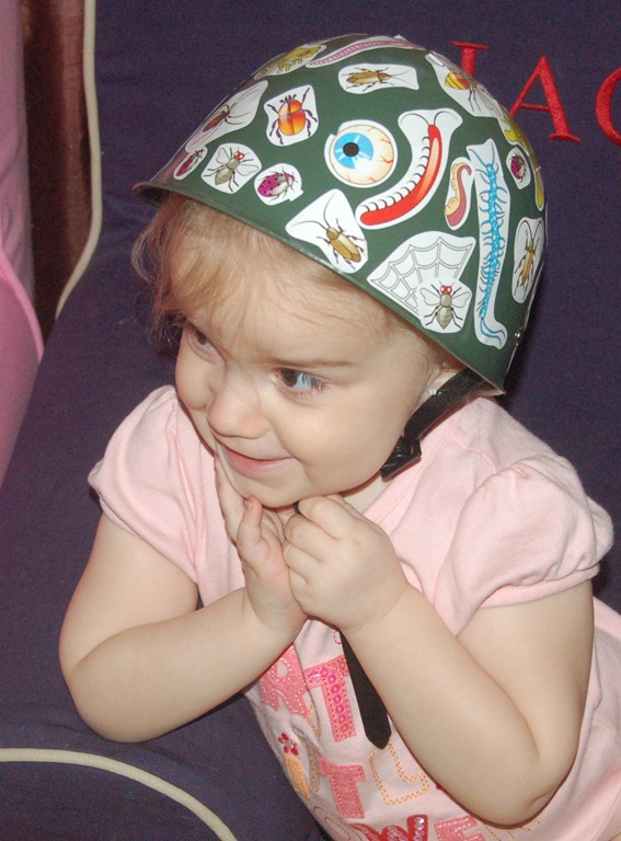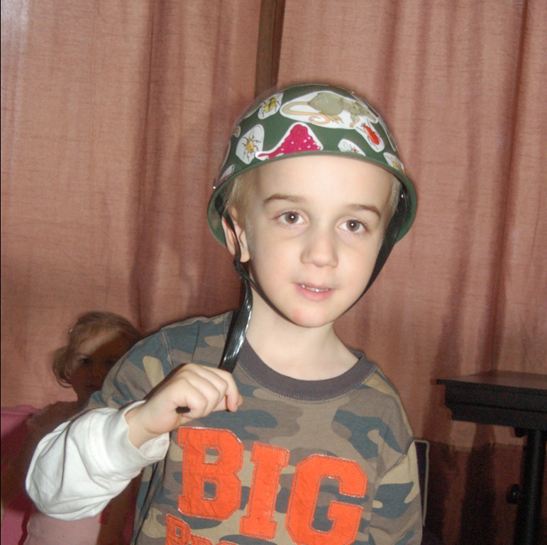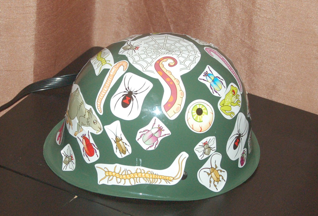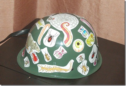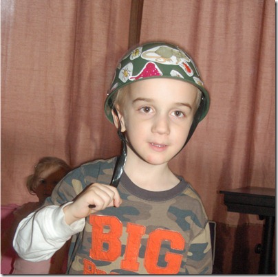This week Jacob’s school is having a different theme every day, today’s was Crazy Hats. The kids were encouraged to design and wear the craziest hats they could think of. So Mommy and Jacob took some of his bug stickers and decorated his army helmet I think it turned out pretty good.
