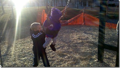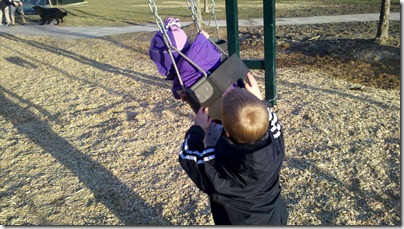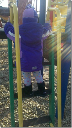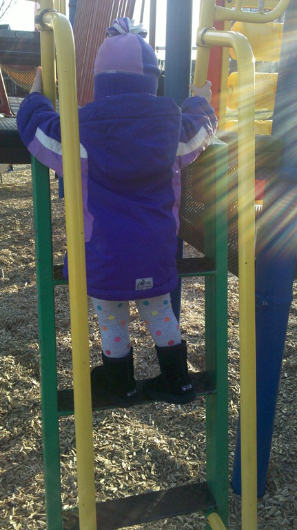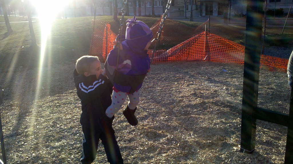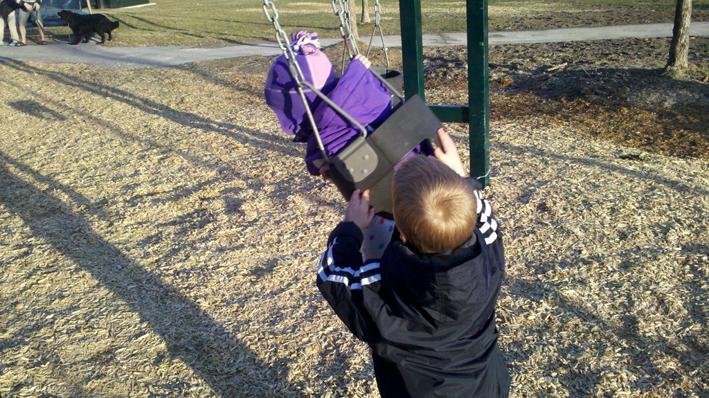 Today after dinner I took the kids to the park. Our picture to-day is of Jacob pushing Violet on the swing. I think it’s one of her favourite things to do at the big park near our house. Of course she also took the time at the park to show me just how much of a big girl she is as she started to climb up one of the ladders in the playground, the photo leads off todays bonus pictures.
