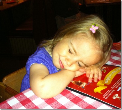 Today after swimming the family head out for dinner. Melissa snapped this picture while we were waiting to order. It seems our little angel was tired after a long day. Well actually she was just playing because she didn’t want mommy to take her picture. But I thought it made a cute picture.