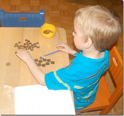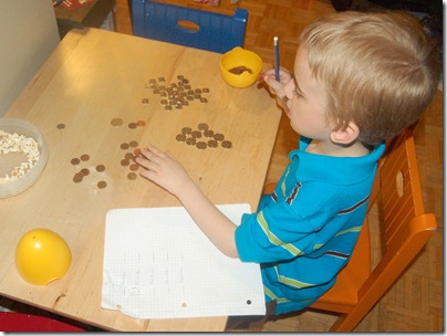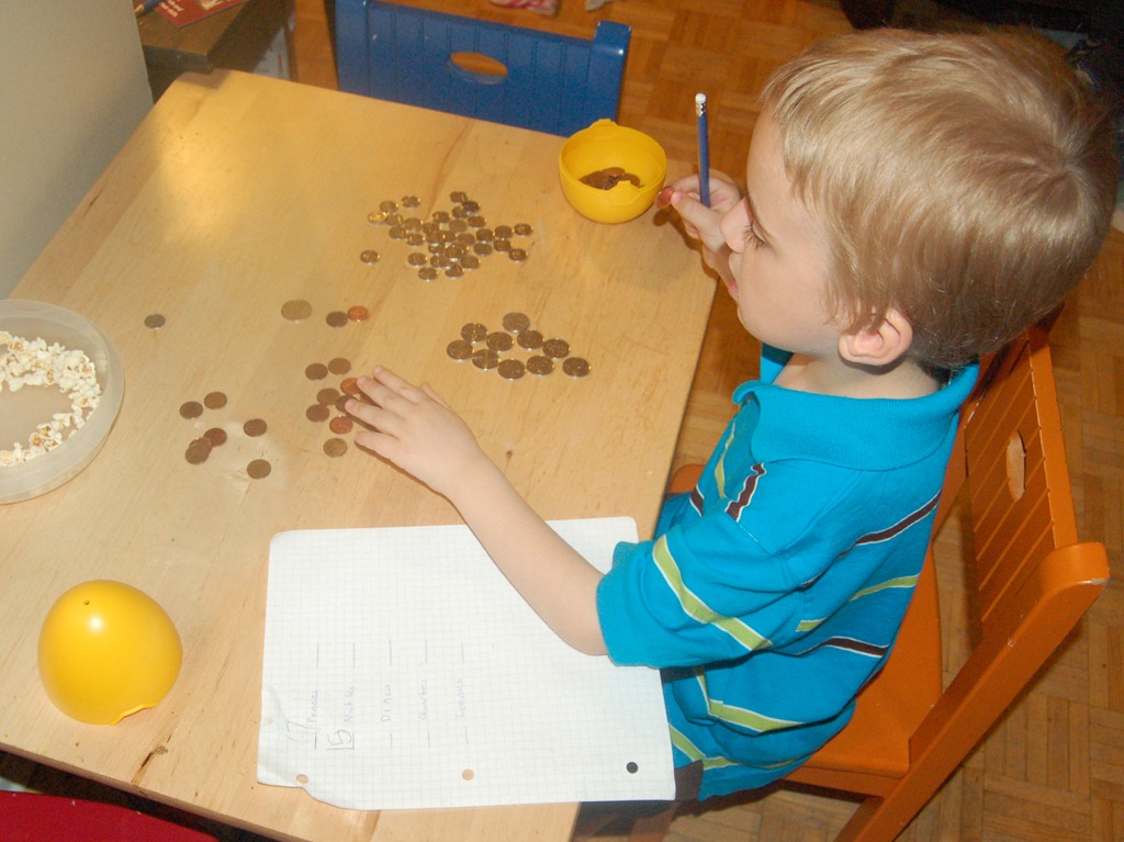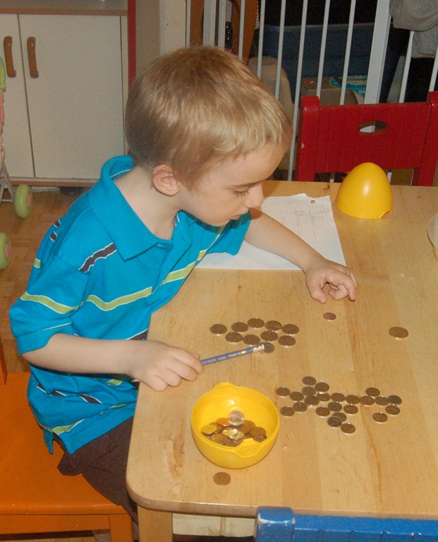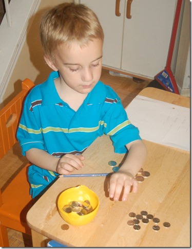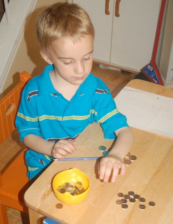Since around Easter Jacob has been collecting change so he can get himself some more Playmobils. Today he sat down to count it. First he separated it by type of coin, then he counted each and wrote it down. Finally we worked out how much it worked out to. His total surprised me. With his 67 Pennies, 15 nickles, 35 dimes 10 quarters and 1 loony he’s got over $10 in his little hoard. As he went off to bed he was quite excited thinking about what he could by with it.