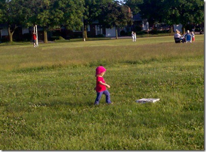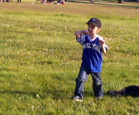 Today after work I loaded the kids up in the car and headed to Jacob’s Blastball practice and game. Our team was short-handed but the kids had fun, fielding and hitting. Our picture is of Jacob as he throws back the ball after a hit by the other team.