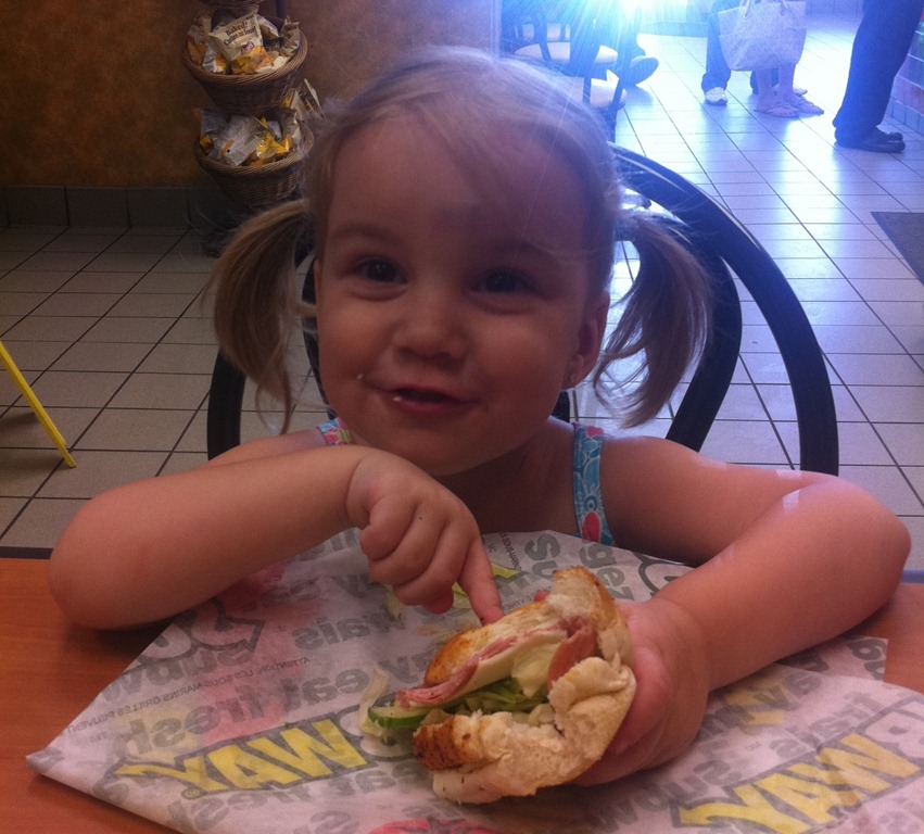 Today Melissa took the kids on a little adventure, first to lunch at Subway and then to the supermarket. Our picture today was taken at lunch. It seems Violet decided it was time to eat her sandwich like a big girl. Usually she would take it apart and eat it in pieces. Today was different today she ate it like a sandwich, a fact that wasn’t lost on her. In this picture she’s tell mommy that she’s eating sandwich like a big girl.