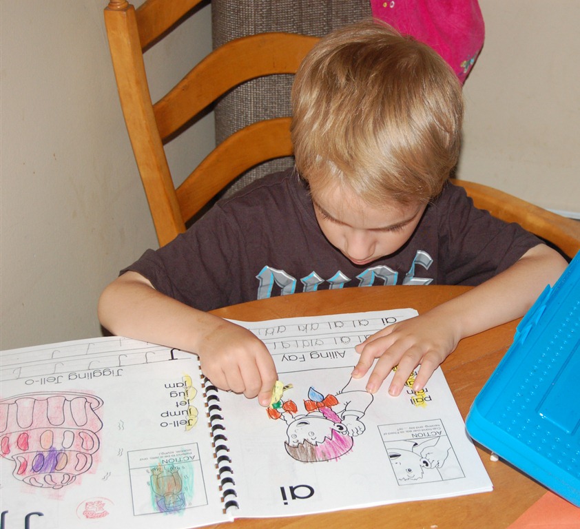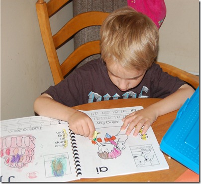 If you have read my blog at all tonight, you know that Jacob’s last day of school was today. So it amused me when I got home today to find him working on his homework. It seems that his teacher had given him an exercise book that they worked on in class. It was a My Letter Sounds Book. Each page has few activities to do, from an action, to colour and of course tracing the letters. Since it wasn’t finished his teacher sent it home to be worked on over the summer. Jacob didn’t waste any time getting into it.