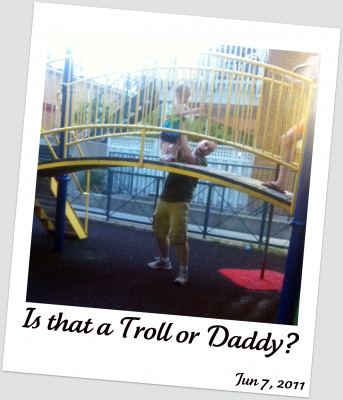 Today before bed Violet was playing out side. It seemed like a good time to try again to revive a game I used to play with Jacob. The old Troll under the bridge game, she runs across the bridge and I try to grab her. Jacob used to love playing it, Violet hasn’t gotten into it. Usually she says ‘I’m the Baby bad troll’ when I would say ‘I’m the Big Bad Troll!”. Though today, with the prompting of the other kids out in the playground she got into it, running and giggling across the bridge.