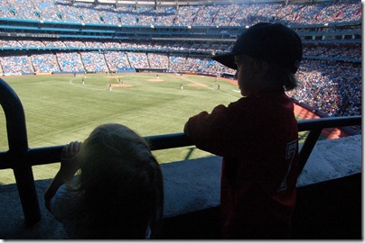 When we signed Jacob up for T-Ball one of the dates we were looking forward to was the trip to the Blue Jays game. As the date approached it became clear that with Melissa working, I either needed to find a baby sitter or take Violet with me. I decided to be brave and order her a ticket. I have to say that she did really well. He had some minor incidents, but over all it was a great day out for the three of us.