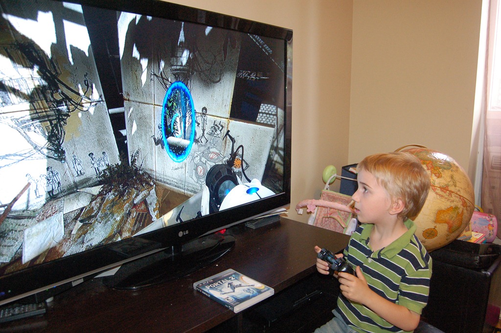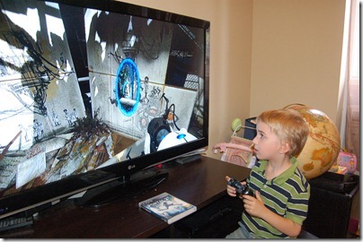 Ever since the family bought me Portal for my birthday Jacob has wanted to play it. I usually had over the control and watch as he tries to figure out the controls and the onscreen puzzles. Today it was just so cute that I had to take a picture of him trying to figure out where to place the portal to get by the puzzle he was on. We’ve only got to games that I let him play on the PlayStation, Portal 2 and Little Big planet. I’m not sure which he prefers, though after watching him again today I wonder if it’s time to get him his first console game.