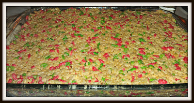 This evening Melissa made some Christmas Rice Crispy squares for Violet’s Pre-School. Tomorrow is her duty day and she’s the snack parent. So she felt the personal touch would be good for the little ones. I would like to say I helped, but all I did was hold the pot while she scooped them into the tray.