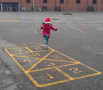 Today while waiting for Jacob at lunch Violet decided to play a little bit of Hopscotch. It was fun watching her through her new Rock ‘Jacob’ and trying to hop through the board. She was having such a fun time she didn’t want to stop when the bell rang and we had to go get Jacob.
