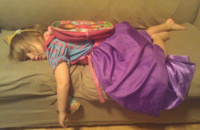This evening I tucked the kids into bed at the usual bed time around 8:30 pm, and I thought they had gone to sleep. It turns out that my boy had fallen asleep, but my daughter decided that she wasn’t ready for sleep. I’m not sure what inspired her to dress up with her back pack and home-made binoculars, I guess she was exploring. but as you can see the only thing she found was sleep.