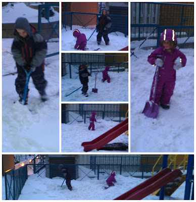The kids love the snow, so today while we were having a lazy afternoon in the house they asked if they could take their new shovels out to have some fun in the playground. It amazed me how much they wanted to get out their. Each managed to get into there winter gear with only a little help from me and before I knew it they were out there playing away. They played out there close to an hour and never complained about the cold, though I think that’s what finally ended the fun in the snow.